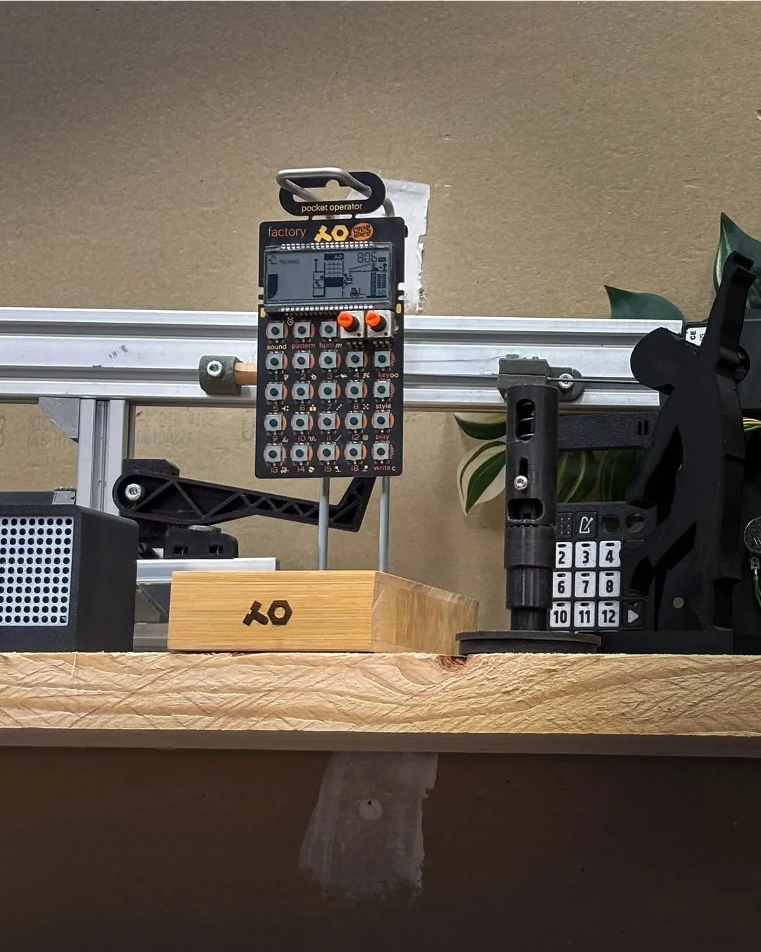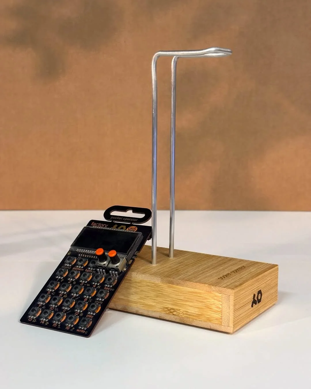 Samen met Lars van Kleef en Semme de Loor maakte ik daarnaast een bijpassende standaard als één-daagse ontwerpuitdaging. De basis is gemaakt van bamboe, met een vorm geïnspireerd op een winkelhaak aansluitend op het silhouet van de Pocket Operator zelf.